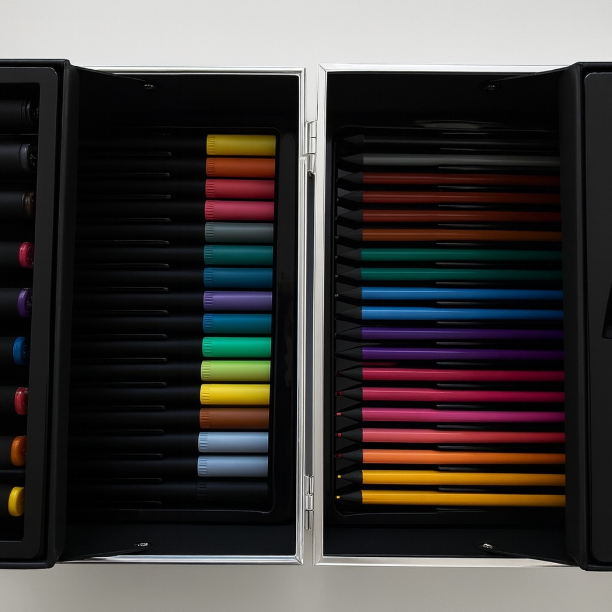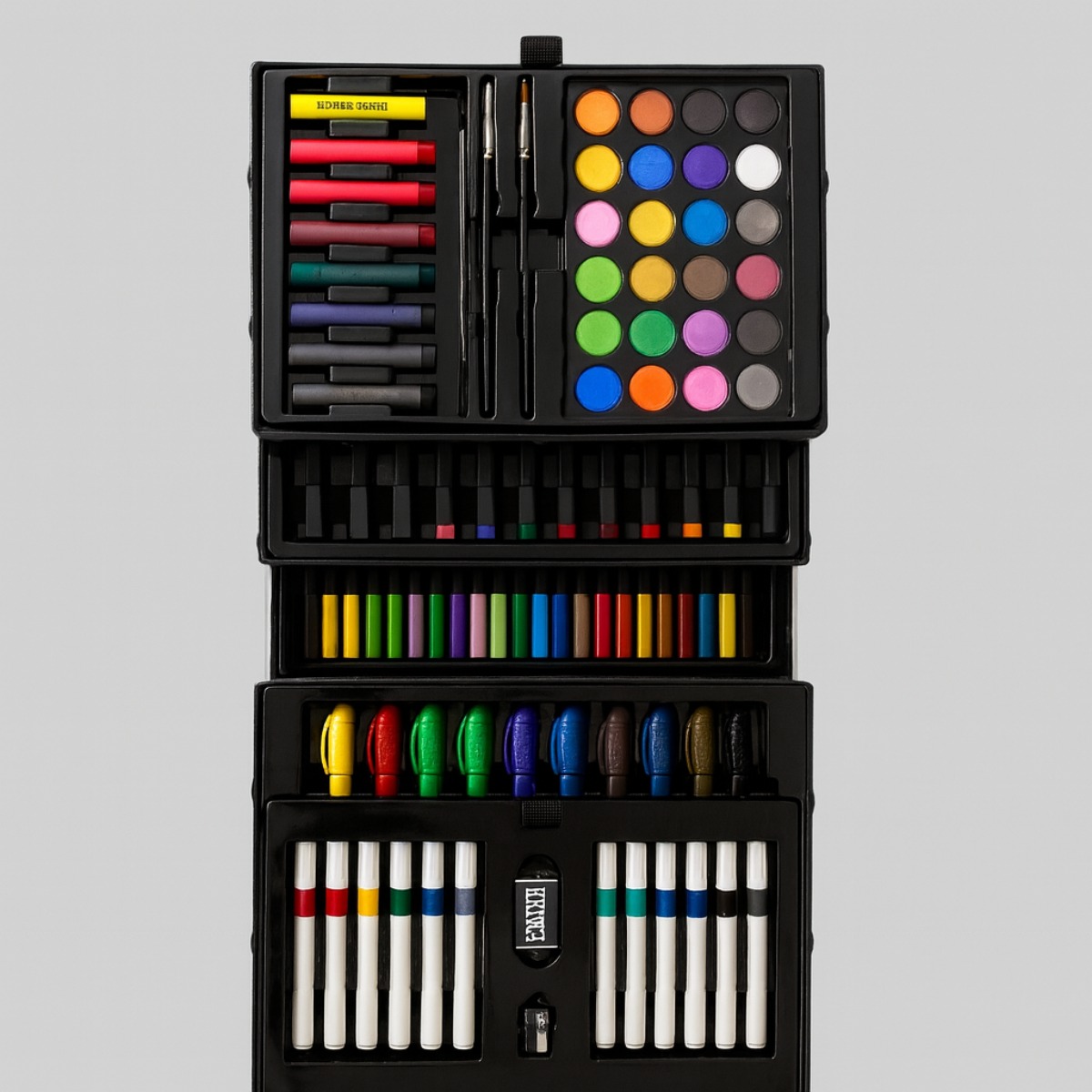 Этот большой набор для рисования предназначен для детей старше 3 лет и состоит из 133 элементов, аккуратно размещённых в ярком и эстетичном сундучке. Такой дизайн значительно снижает риск потери карандашей и облегчает транспортировку, что делает использование набора более удобным для ребёнка. Сундучок также устойчив к ударам и падениям, что обеспечивает долговечность набора. Каждый элемент имеет своё место, что способствует организации и поддержанию порядка.