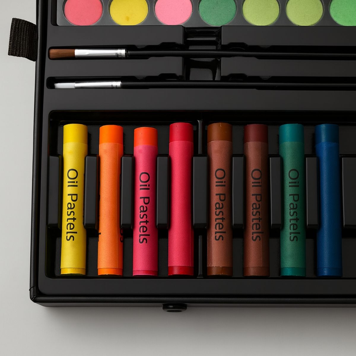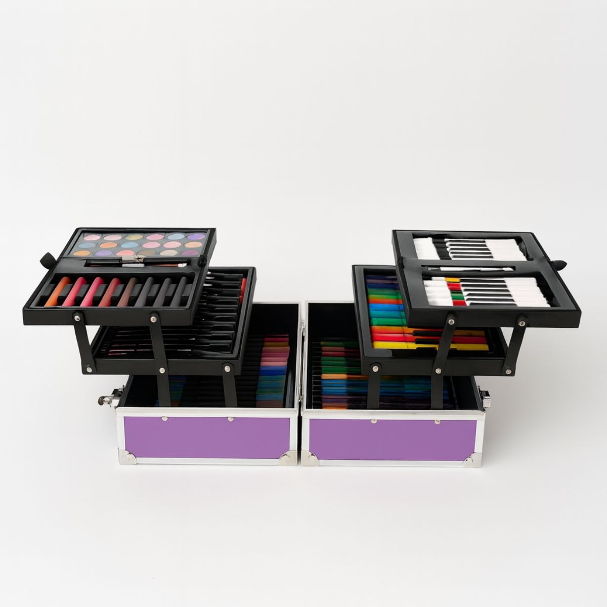 Этот большой набор для рисования предназначен для детей старше 3 лет и состоит из 133 элементов, аккуратно размещённых в ярком и эстетичном сундучке. Такой дизайн значительно снижает риск потери карандашей и облегчает транспортировку, что делает использование набора более удобным для ребёнка. Сундучок также устойчив к ударам и падениям, что обеспечивает долговечность набора. Каждый элемент имеет своё место, что способствует организации и поддержанию порядка.