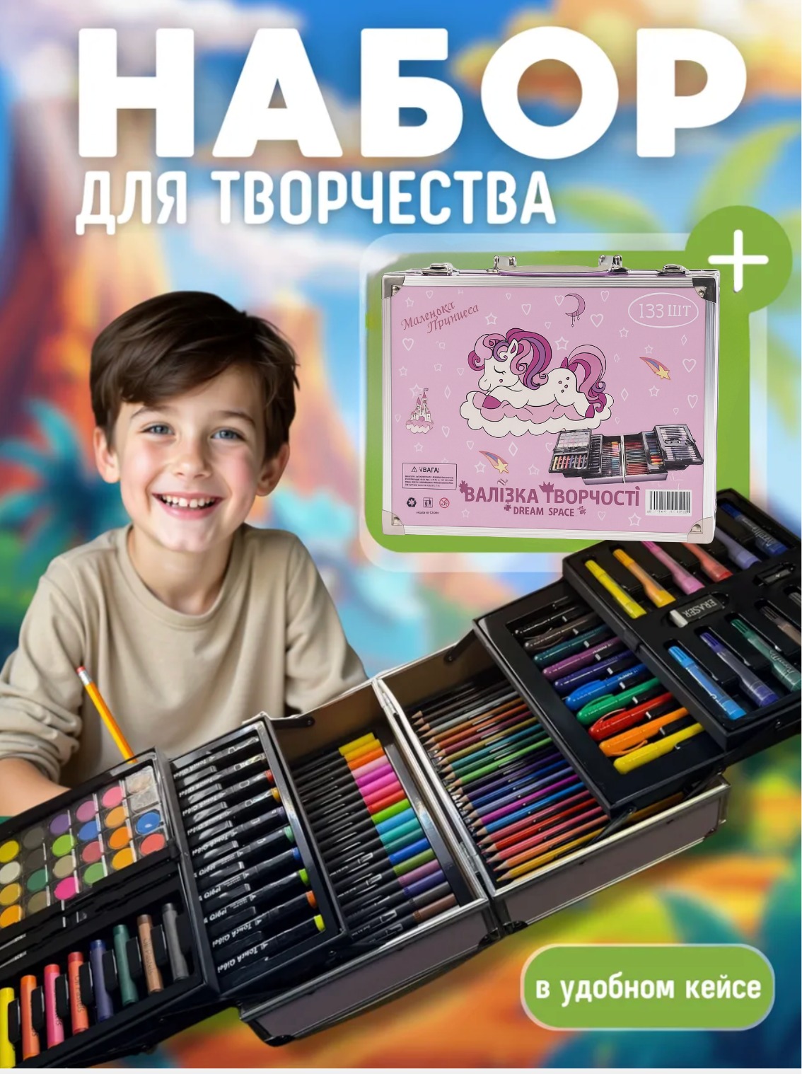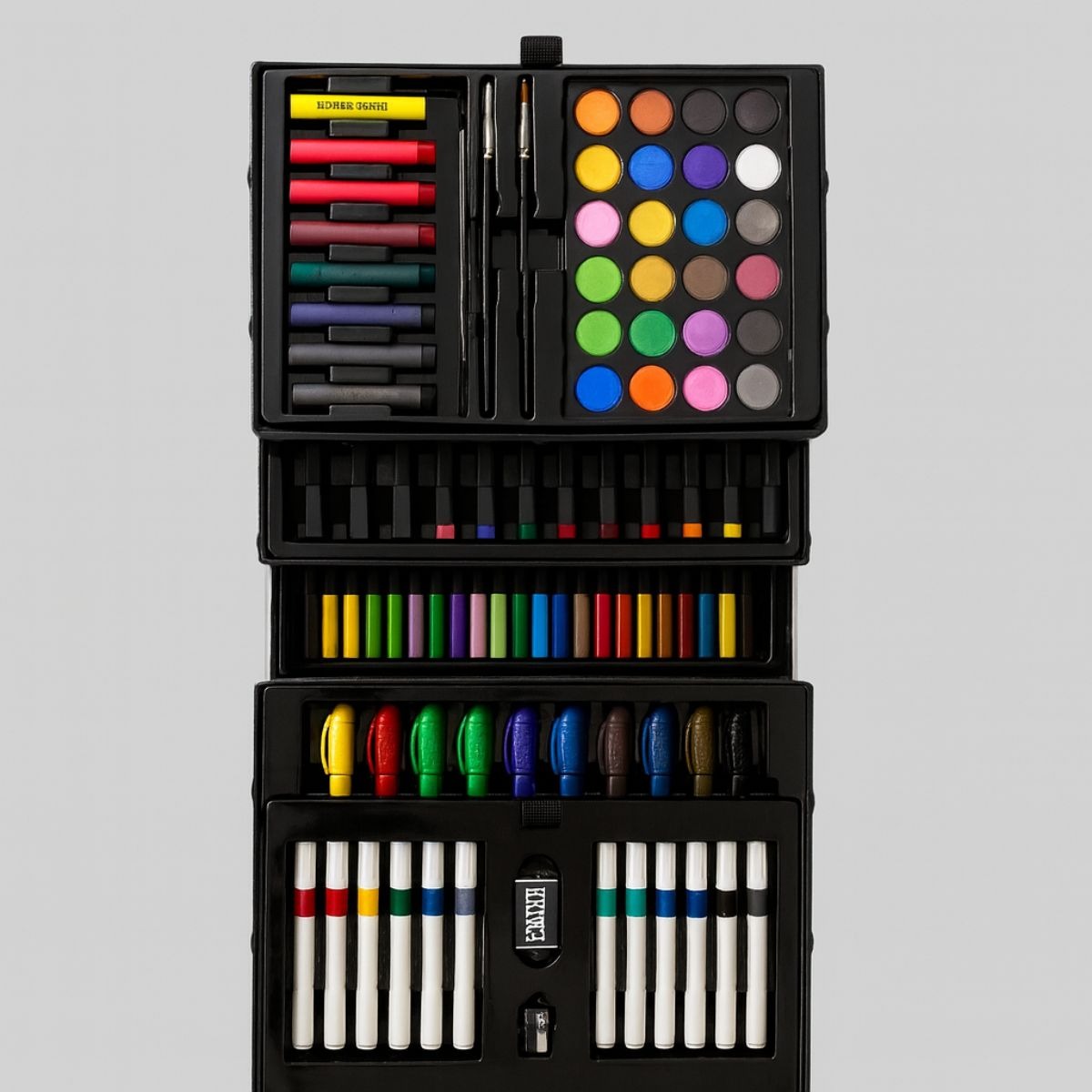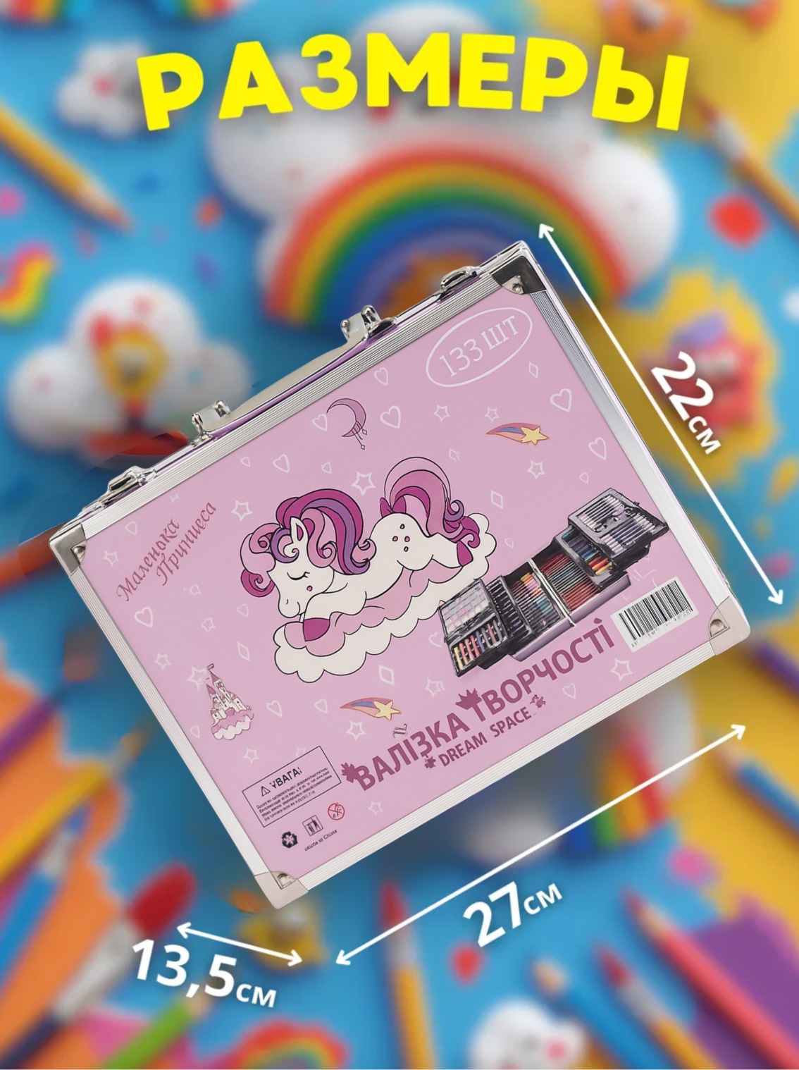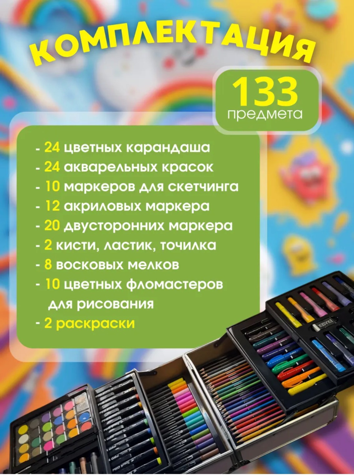 Внутри прочного и красивого чемоданчика собрано 133 предмета: фломастеры, восковые мелки, цветные карандаши, краски, кисточки, точилка, ластик и две раскраски.