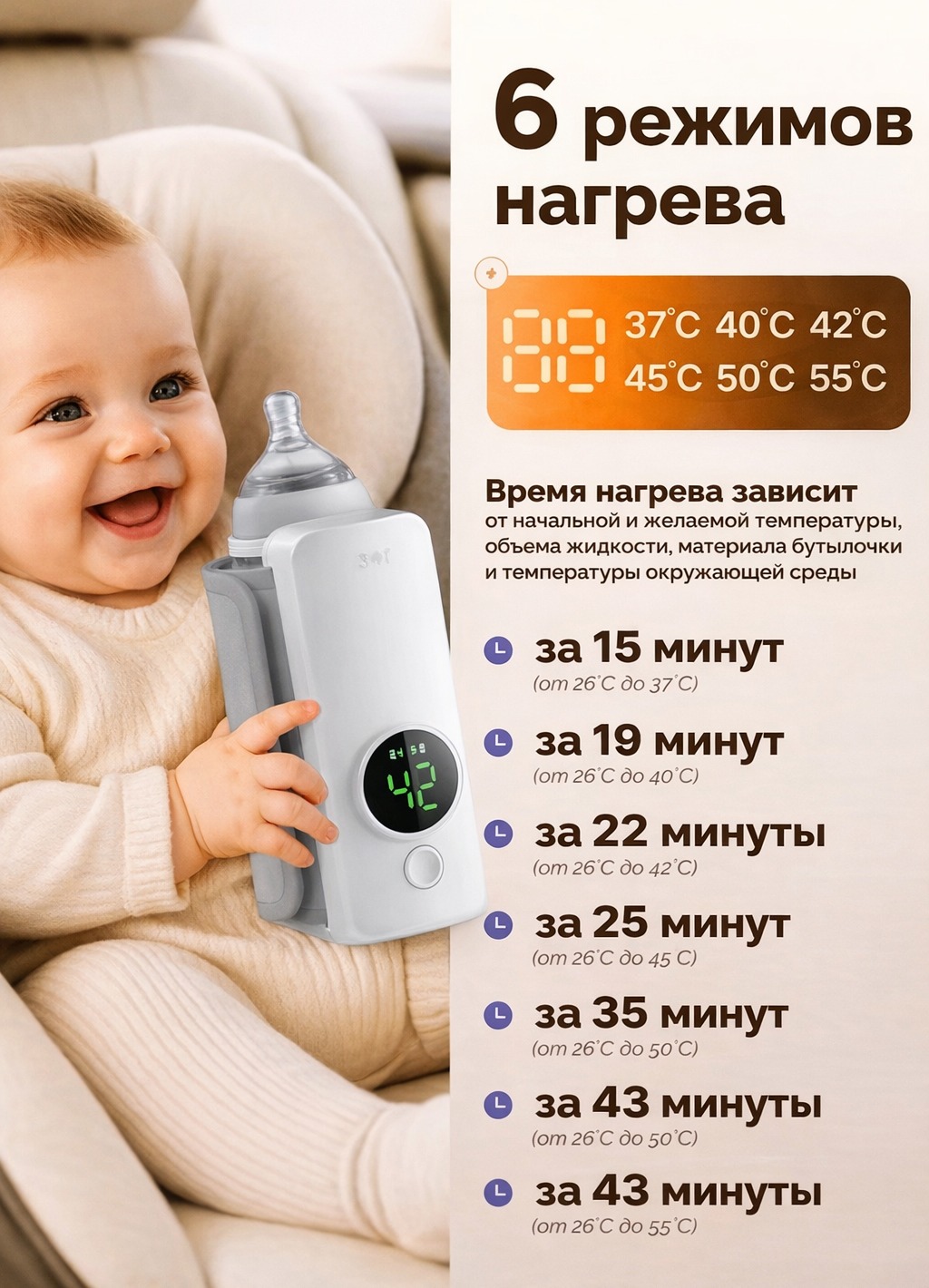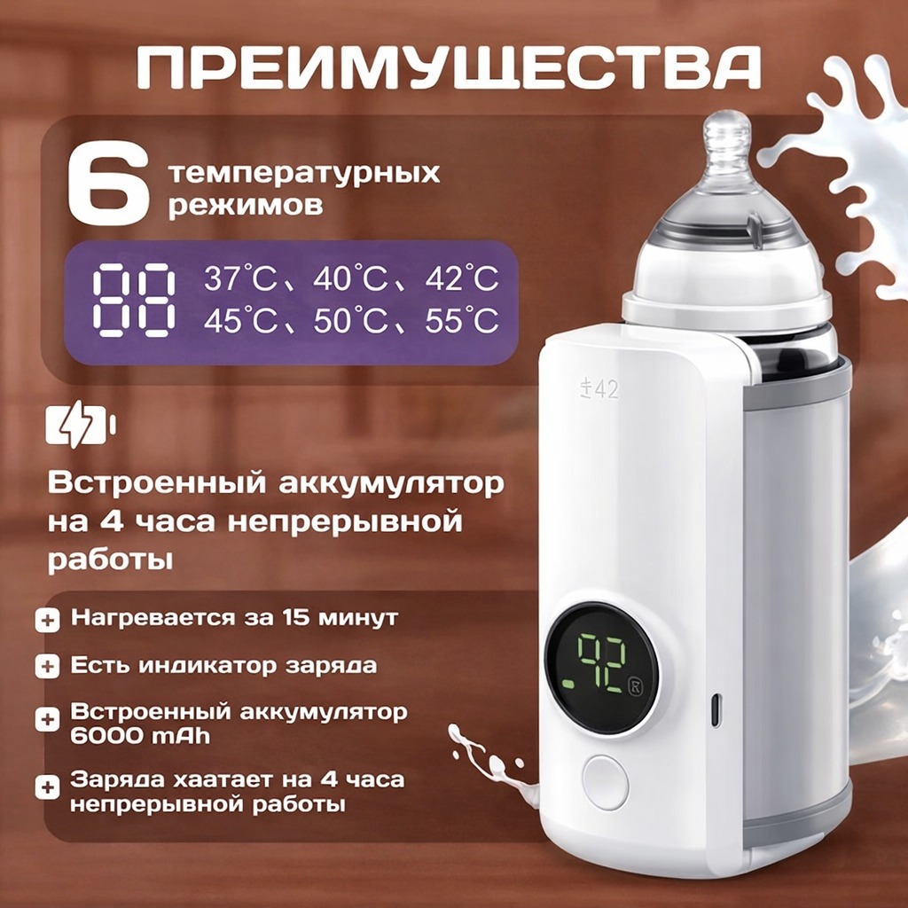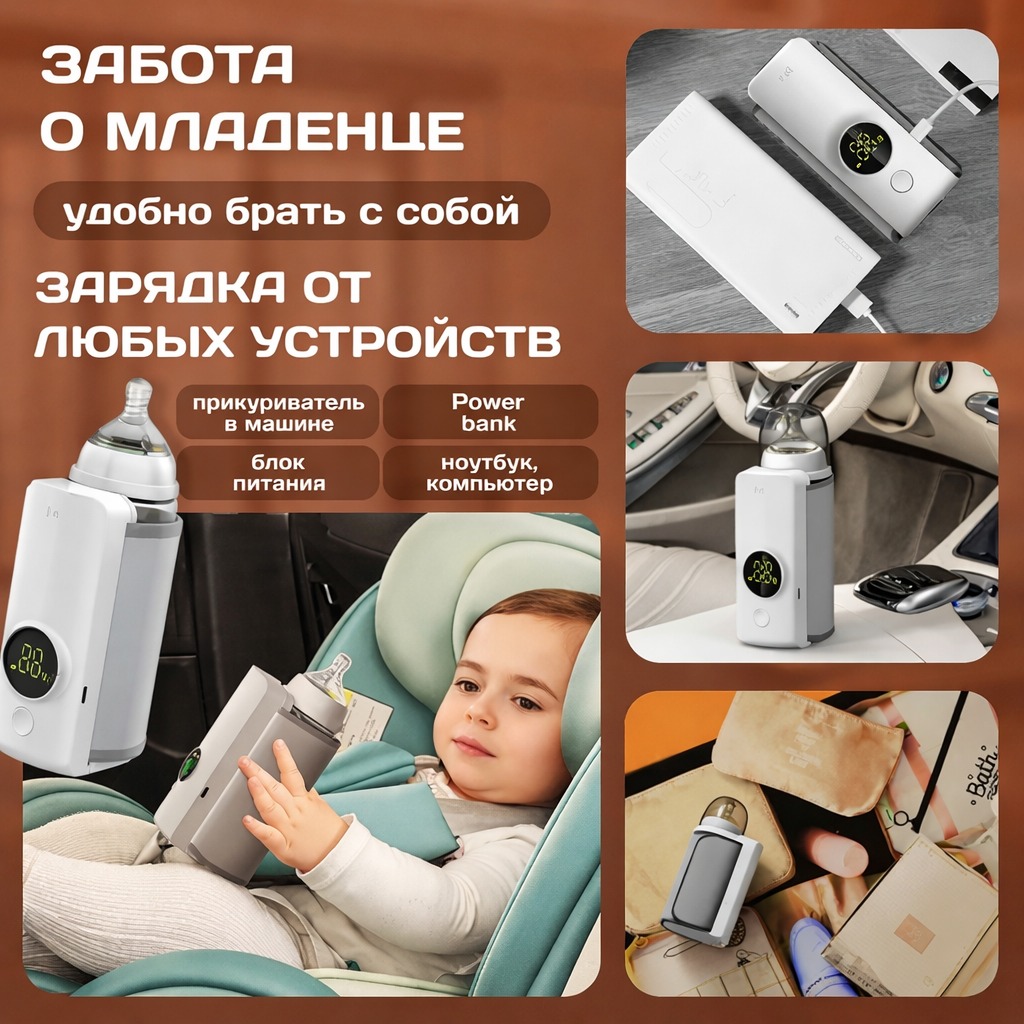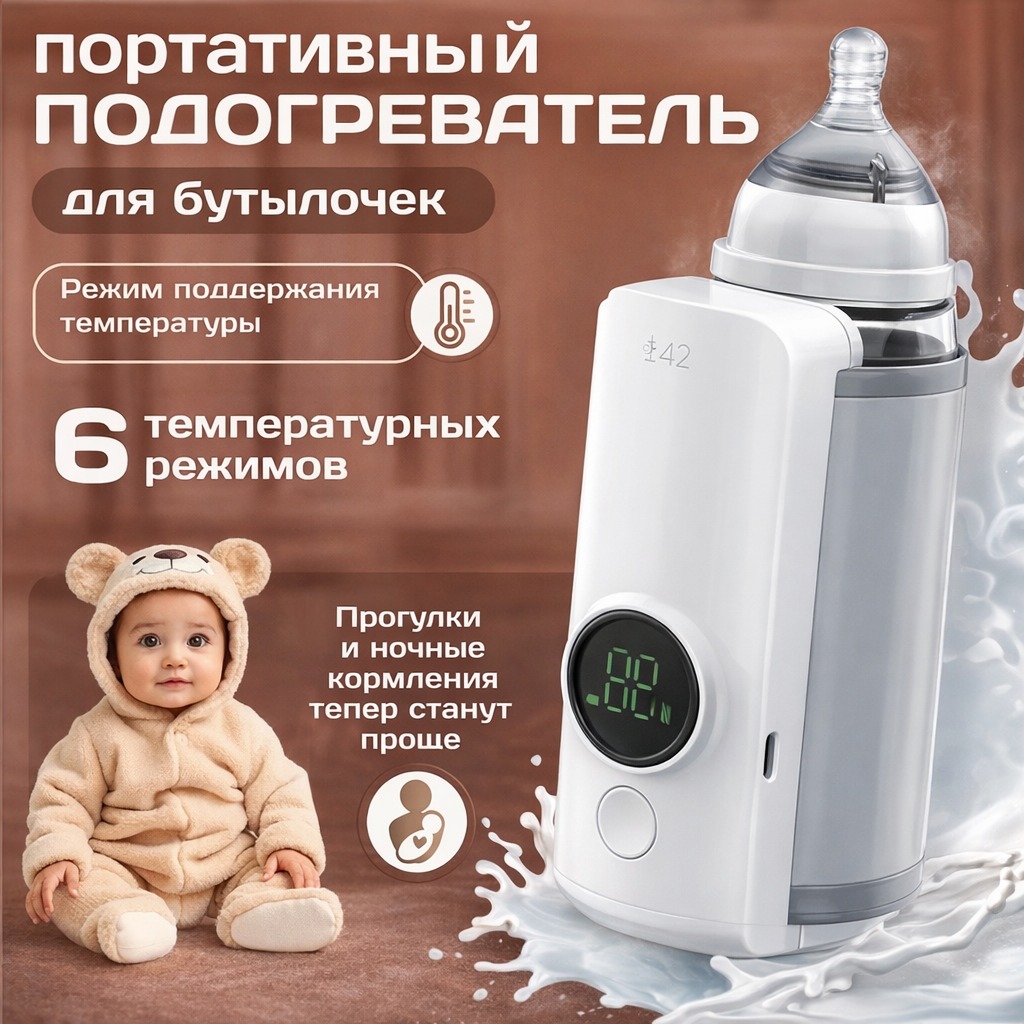 Портативный подогреватель для бутылочек — это современное и практичное устройство, созданное для быстрого и безопасного подогрева детского питания, молока и смесей до оптимальной температуры. Благодаря беспроводному дизайну и продуманным технологиям он идеально подходит для использования дома, на прогулке или в дороге, обеспечивая комфорт родителям и правильную температуру для малыша.