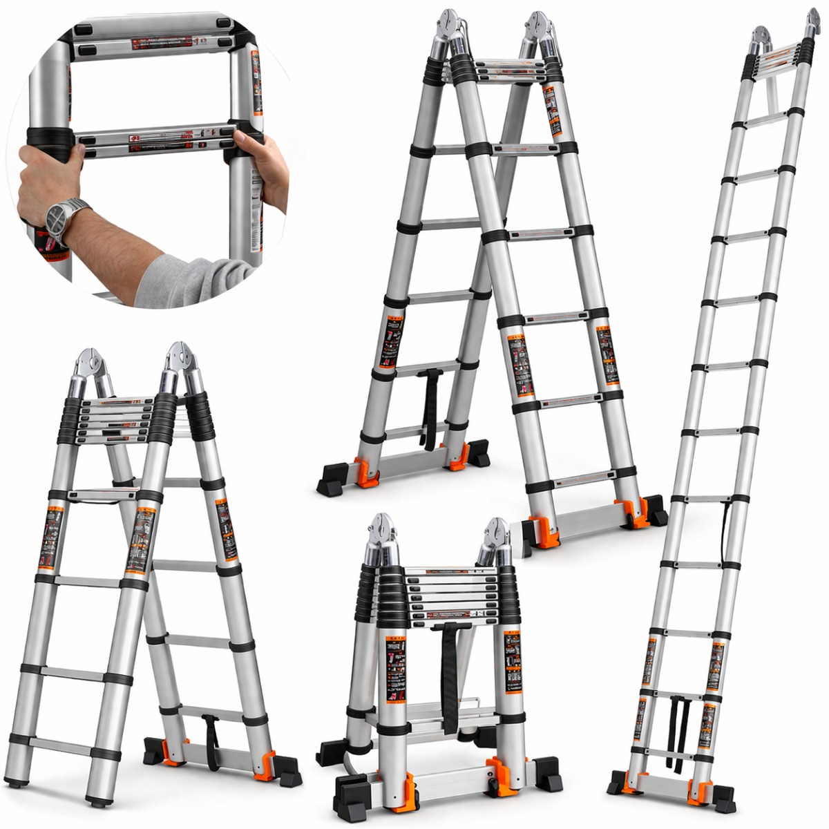 Шарнирная телескопическая алюминиевая лестница — надёжное и универсальное решение для работ на высоте дома, на даче или на стройке. Прочная алюминиевая конструкция сочетает в себе легкость, долговечность и удобство в использовании. Благодаря шарнирному механизму лестницу можно использовать в различных положениях: как приставную, стремянку или платформу. Противоскользящие ступени, устойчивые опоры и компактное складывание обеспечивают безопасность, комфорт и удобное хранение.