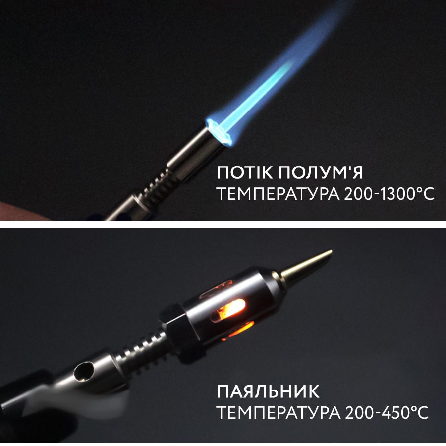 Кількість режимів 2 режими: паяльник і газовий пальник Об'єм бака палива 8 мл Час роботи без дозаправки 60 хвилин Матеріали Метал і пластик ABS Температура відкритого полум'я До+1300°C Температура паяльника До +450°C Кількість змінних насадок 2 штуки Регулювання температури Присутнє