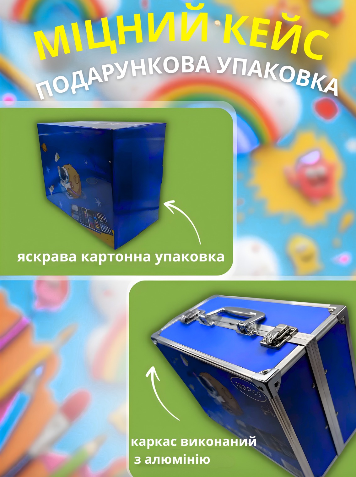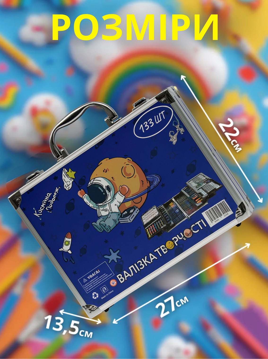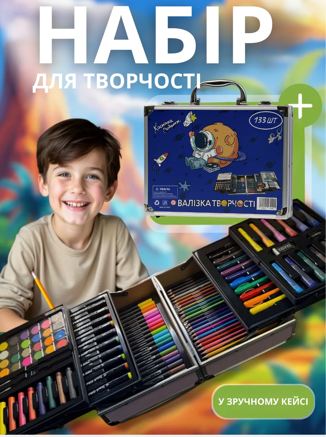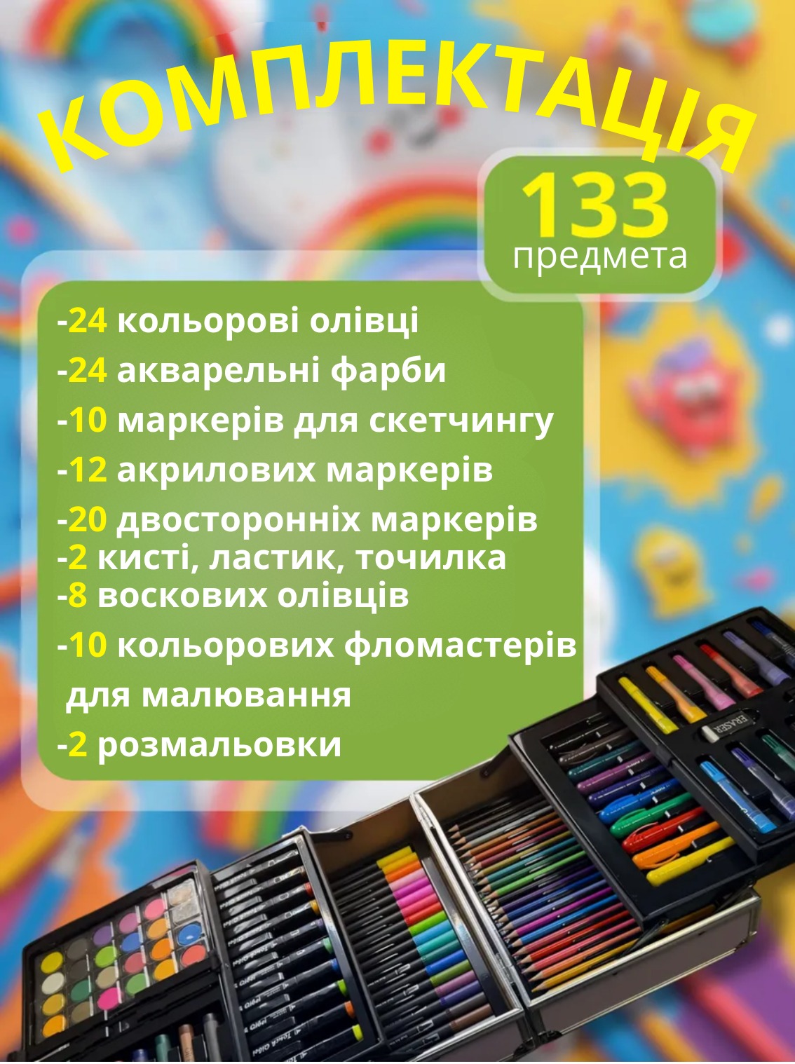 Усередині зручного кейса зібрано 133 предмети: фломастери, кольорові олівці, воскові крейди, фарби, пензлики, точилка, ластик і навіть дві розмальовки.