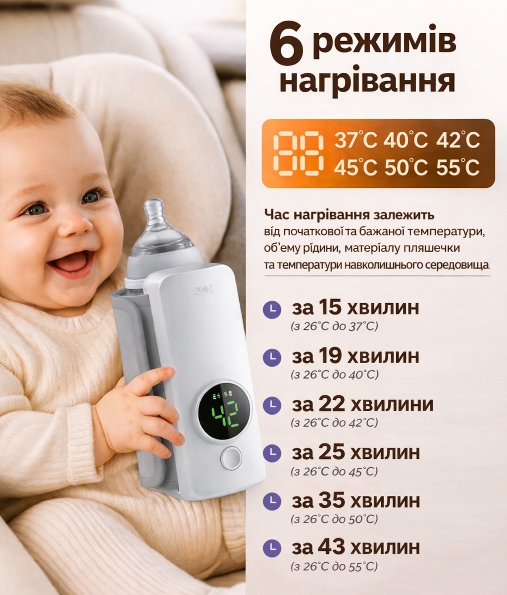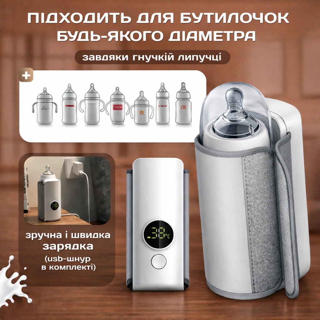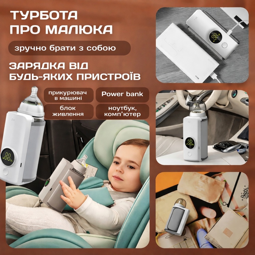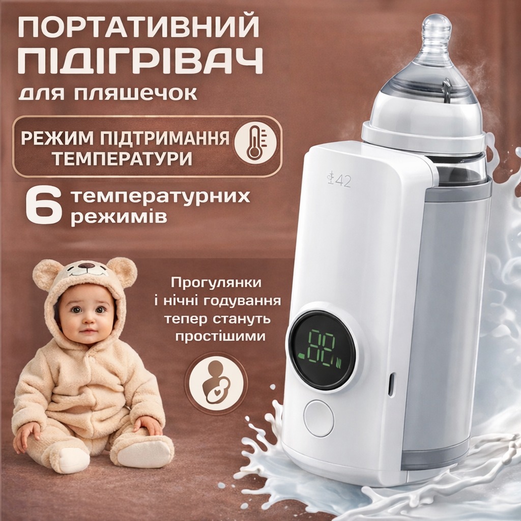 Портативний підігрівач для пляшечок — це сучасний та практичний пристрій, створений для швидкого і безпечного підігріву дитячого харчування, молока та сумішей за оптимальної температури. Завдяки бездротовому дизайну і передовим технологіям він ідеально підходить для використання вдома, на прогулянці чи в дорозі, забезпечуючи комфорт батькам і правильну температуру для вашого малюка.