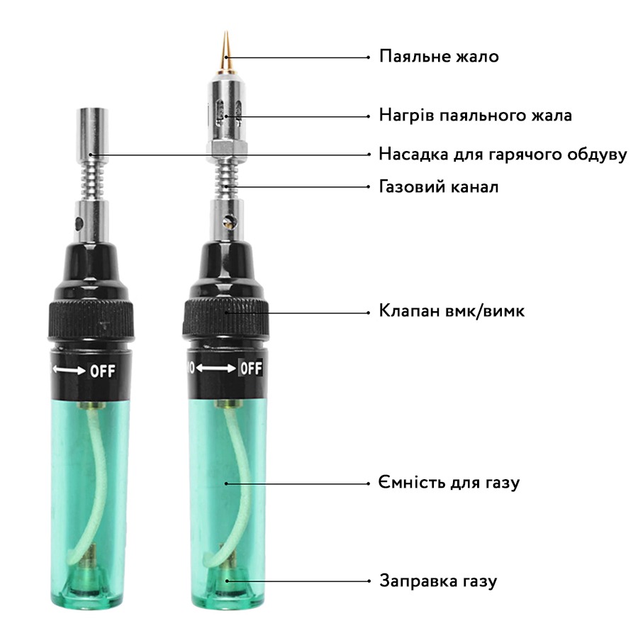 | Особливості | Маленький розмір, швидкий прогрів жала, простий і інтуїтивний у використанні, заправляється як запальничка, зручне регулювання температури |
