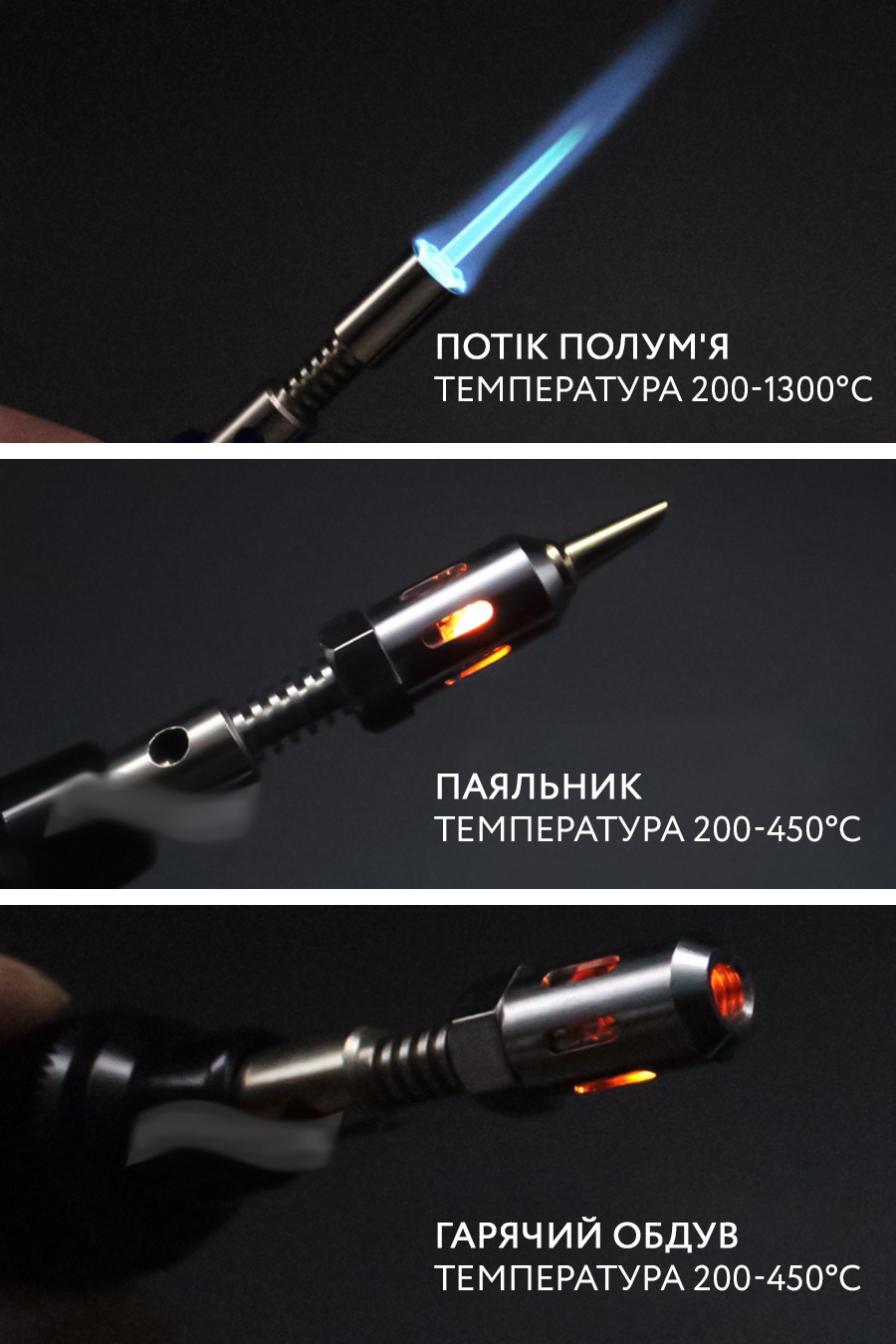 | Кількість режимів | 2 режими: паяльник і газовий пальник |
